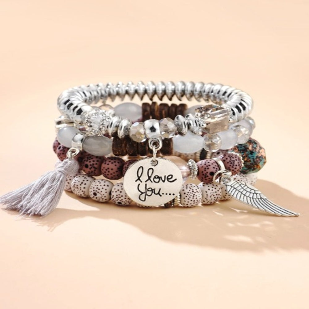 Embrace effortless style and heartfelt charm with this Trendy Bohemian Bracelet Stack for women and girls, featuring elegant silver beads, a delicate tassel, and a meaningful ‘I Love You’ pendant. Designed with layered textures and intricate detailing, this bracelet set beautifully captures the free-spirited essence of boho fashion while adding a touch of sophistication to any outfit. The combination of metallic accents, earthy tones, and symbolic charms like the wing and tassel makes it a perfect accessory for expressing love, positivity, and individuality. Comfortable, stretchable, and easy to wear, it complements both casual and festive looks, making it an ideal choice for gifting or personal style enhancement.