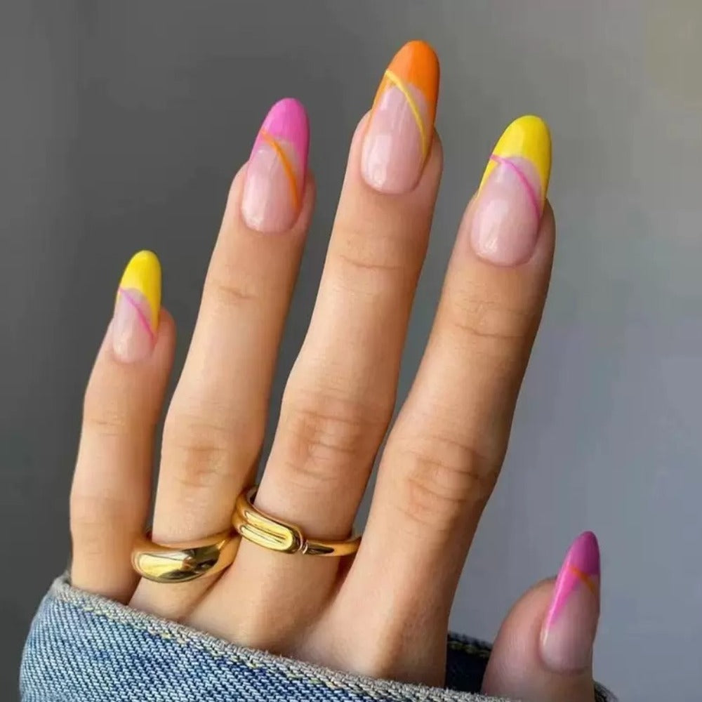 Add a burst of color to your look with this Vibrant Neon French Tip Almond Nail Set. Featuring a striking mix of pink, yellow, and orange tips on a glossy nude base, these artificial nails bring bold, trendy energy to any outfit. Designed for modern women, they are lightweight, durable, and easy to apply, offering a perfect salon-quality finish in minutes. Ideal for parties, holidays, or everyday glam, these nails make a stylish statement wherever you go.